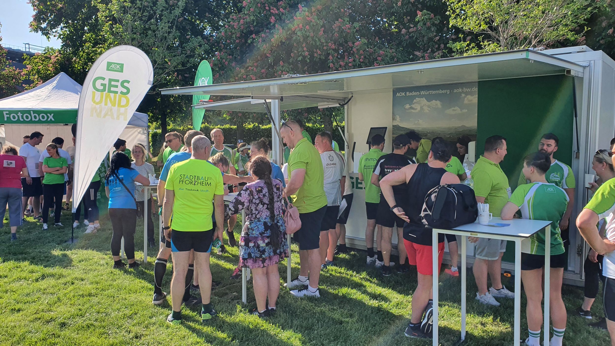 Sie und alle weiteren Firmenläuferinnen und -läufer wurden mit stimmungsvoller Musik von DJ Christian Weick und Moderator Sebastian Hess im Ziel empfangen. Dort angekommen stand für alle Finisher Obst und Gemüse von der AOK Baden-Württemberg, alkoholfreies Bier von ERDINGER Alkoholfrei sowie Mineralwasser von Peterstaler zum Auffüllen der Energiespeicher bereit.