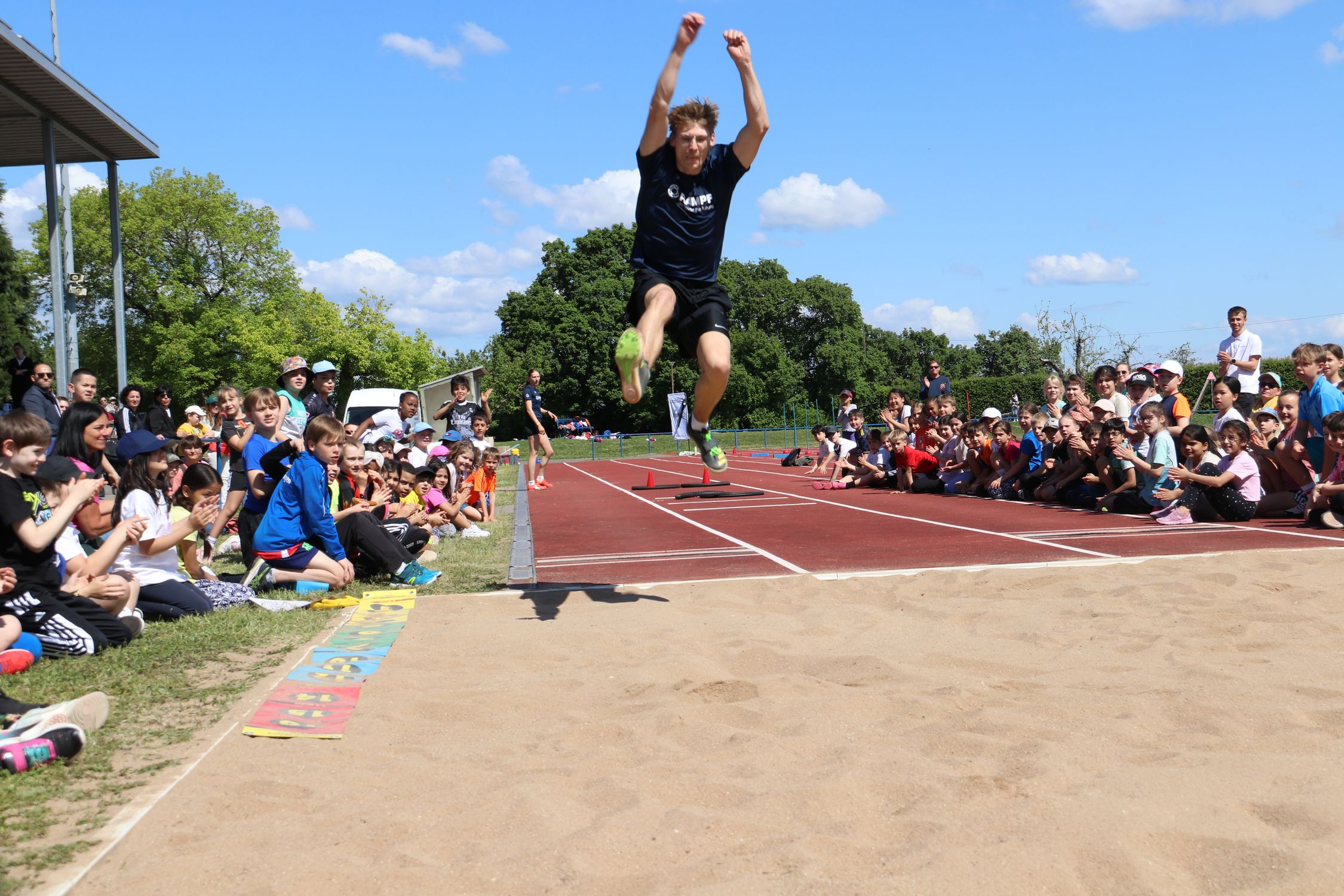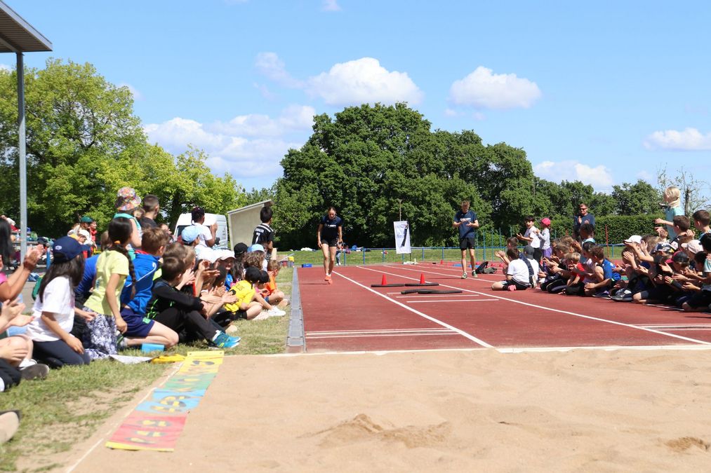 Am Tag danach ging es für das WLV-Projektteam dann nach Metzingen an die Sieben-Keltern-Schule. Auch hier wurde fast vier Stunden lang gerannt, gesprungen und geworfen, was das Zeug hielt. Rund 400 Kinder feuerten sich im Otto-Dipper-Stadion gegenseitig an und gaben ihr Bestes. Die TuS Metzingen machte ihrem Slogan „Mir gäbet Älles!“ alle Ehre und durch ihr Engagement wurde auch für die Metzinger Grundschüler:innen der Sporttag eine wunderbare Erinnerung. Vor allem die Topathlet:innen Carla Kussmaul und Kristian Hren waren ein großes Highlight für alle Kinder. Nach ihrer Vorführung im Weitsprung konnten sich die zwei Athlet:innen des TuS kaum vor Fans retten.