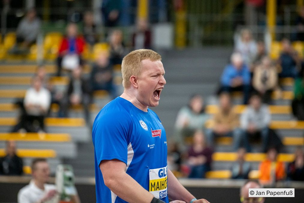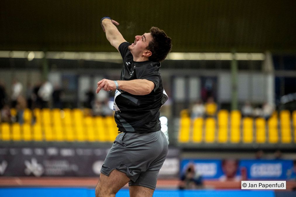Der Freitagabend in der Helmut-Körnig-Halle begann mit dem Kugelstoßen der Männer. Der Deutsche Meistertitel geht an Eric Maihöfer vom VfL Sindelfingen mit einer Weite von 20,37 Meter. Eric erreichte dabei mit drei gültigen Versuchen nicht nur den ersten Platz, sondern auch eine neue persönliche Bestleistung sowie die Leistungsbestätigungsnorm für einen Start bei der Hallen-EM. Die Silbermedaille geht ebenfalls an einen Athleten aus Baden-Württemberg, nämlich Silas Ristl, ebenfalls vom VfL Sindelfingen. Er wuchtete seine 7,26 Kilogramm schwere Kugel auf 19,68 Meter. Knapp am Siegertreppchen vorbei schrammte Tizian Lauria (VfL Sindelfingen) und wurde Vierter. Sein bester Versuch landete bei 19,10 Meter, außerdem gelang ihm damit eine neue Saisonbestleistung. Direkt dahinter auf Platz 5 lag Simon Bayer vom LAC Essingen. Simon hatte etwas Pech und hatte nur einen gültigen Versuch. Der eine gültige Versuch war 19,03 Meter weit. Ebenfalls Pech hatte leider Lasse Schulz vom TV Plieningen. Lasse gelang auch nur ein gültiger Versuch. Seine Kugel flog auf 17,26 Meter und brachte ihn auf Platz 12.