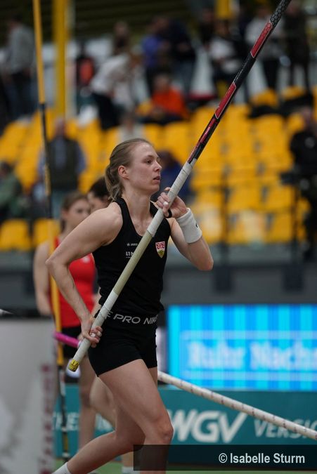 Anjuli Knäsche (VfB Stuttgart 1893) sichert sich den Titel der deutschen Meisterin mit einer neuen Saisonbestleistung von 4,50 Meter. An 4,55 Meter, was eine neue persönliche Bestleistung bedeuten würde, scheitert sie anschließend knapp. Anna Hiesinger (LAZ Ludwigsburg) schafft nach dem U20 DM-Titel vergangenes Wochenende auch bei der DM der Aktiven den Sprung aufs Siegertreppchen. 4,10 Meter bedeuten für sie den Gewinn der Bronze-Medaille.