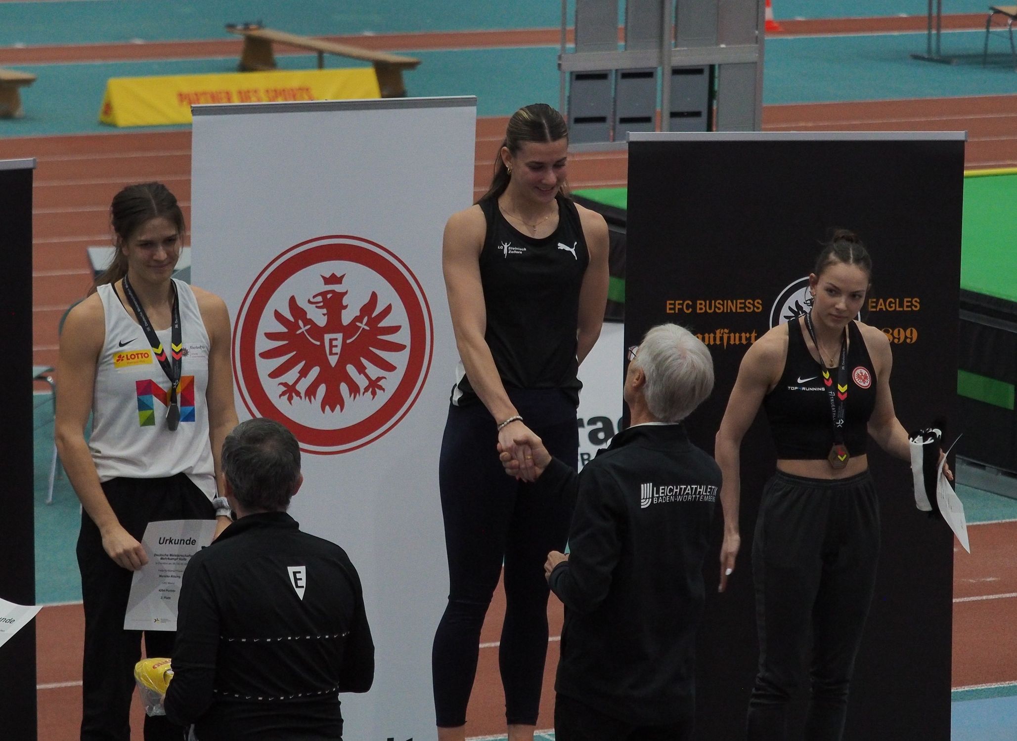 Vier Bestleistungen in fünf Disziplinen gelangen Sandrina Sprengel. Einzig im Hochsprung (1,66 m) blieb die 20-Jährige hinter ihren Erwartungen. Zuvor war sie mit 8,45 Sekunden als Siegerin in den Fünfkampf gestartet. Im Kugelstoßen fehlte nur ein Zentimeter zum ersten 14-Meter-Stoß – und dann ließ die Baden-Württembergerin das Sahnehäubchen folgen: 6,42 Meter im Weitsprung! Die 800 Meter bestritt sie von der Spitze und rannte mit 2:18,28 Minuten auch schneller als bei ihrer Freiluft-Bestleistung.