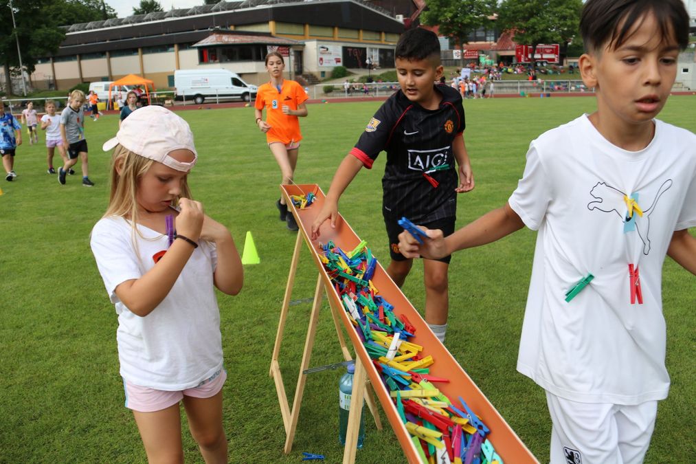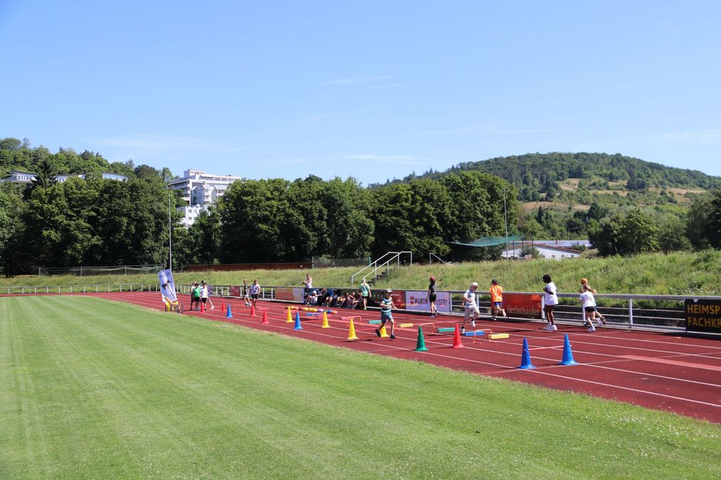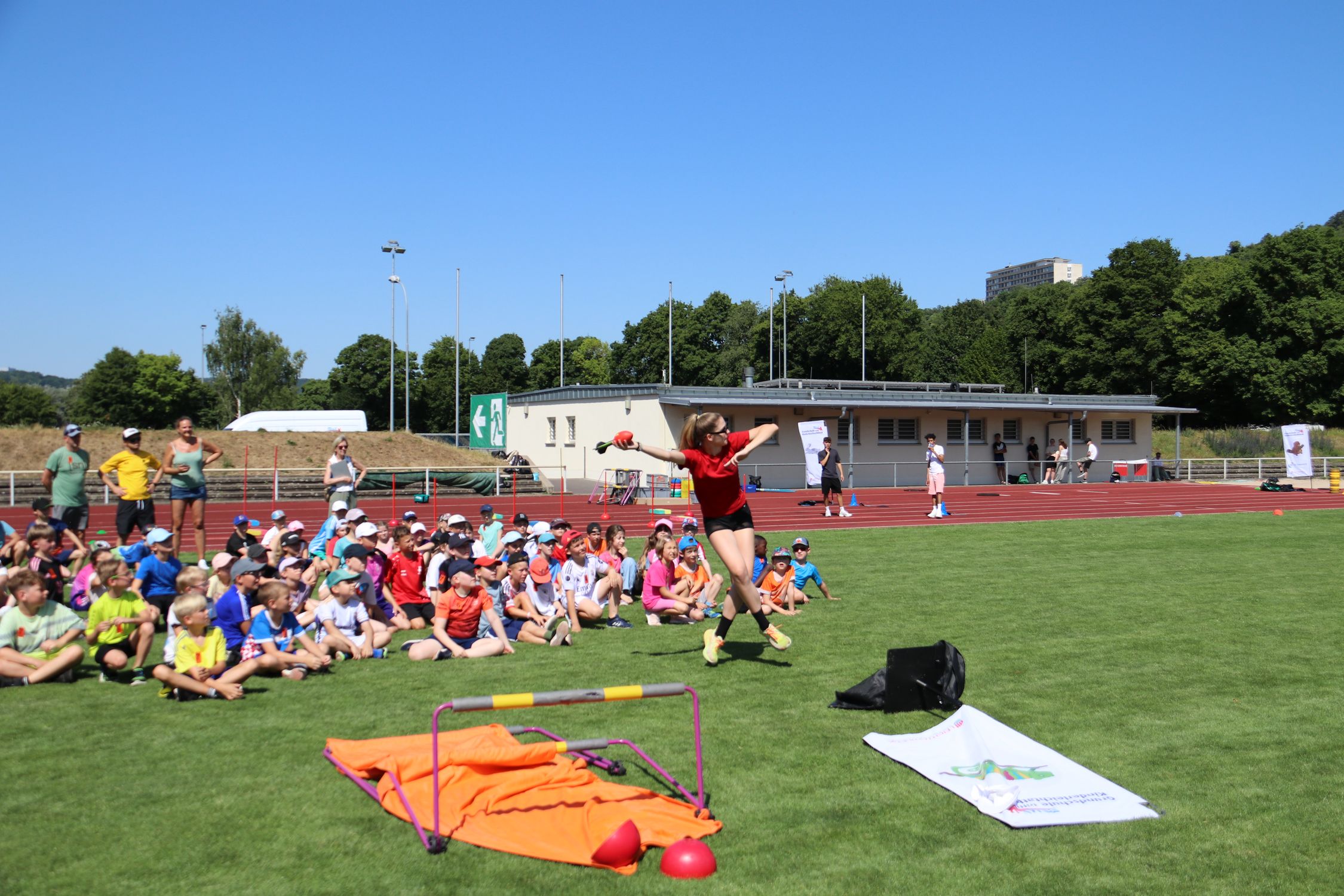 Am Montag, dem 30. Juni, ging es für unser Projektteam weiter nach Igersheim. In Igersheim durften auch die Kinder der Johann-Adam-Möhler-Schule die acht Stationen bewältigen. Die Kinder trotzten dem heißen Wetter und meisterten alle acht Stationen ohne Probleme. Rund 200 Kinder sprinteten, sprangen, warfen und liefen, was das Zeug hielt. Dank der Helfer:innen der 9. Klasse der Realschule konnte den Kindern ein unvergessliches Ereignis auf die Beine gestellt werden. Auch vor Ort waren die Vertreter des FC Igersheim, die die Veranstaltung mit Top-Athleten und einer Wurfvorführung unterstützten. Hier zeigten die Athleten, wie weit man einen Heuler werfen kann. Ein besonderer Dank geht auch an die AOK, die die Kinder bei den hohen Temperaturen mit leckerem Obst versorgte.