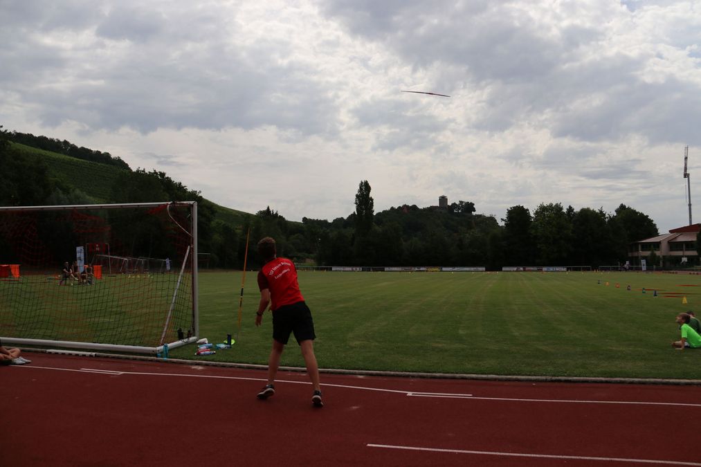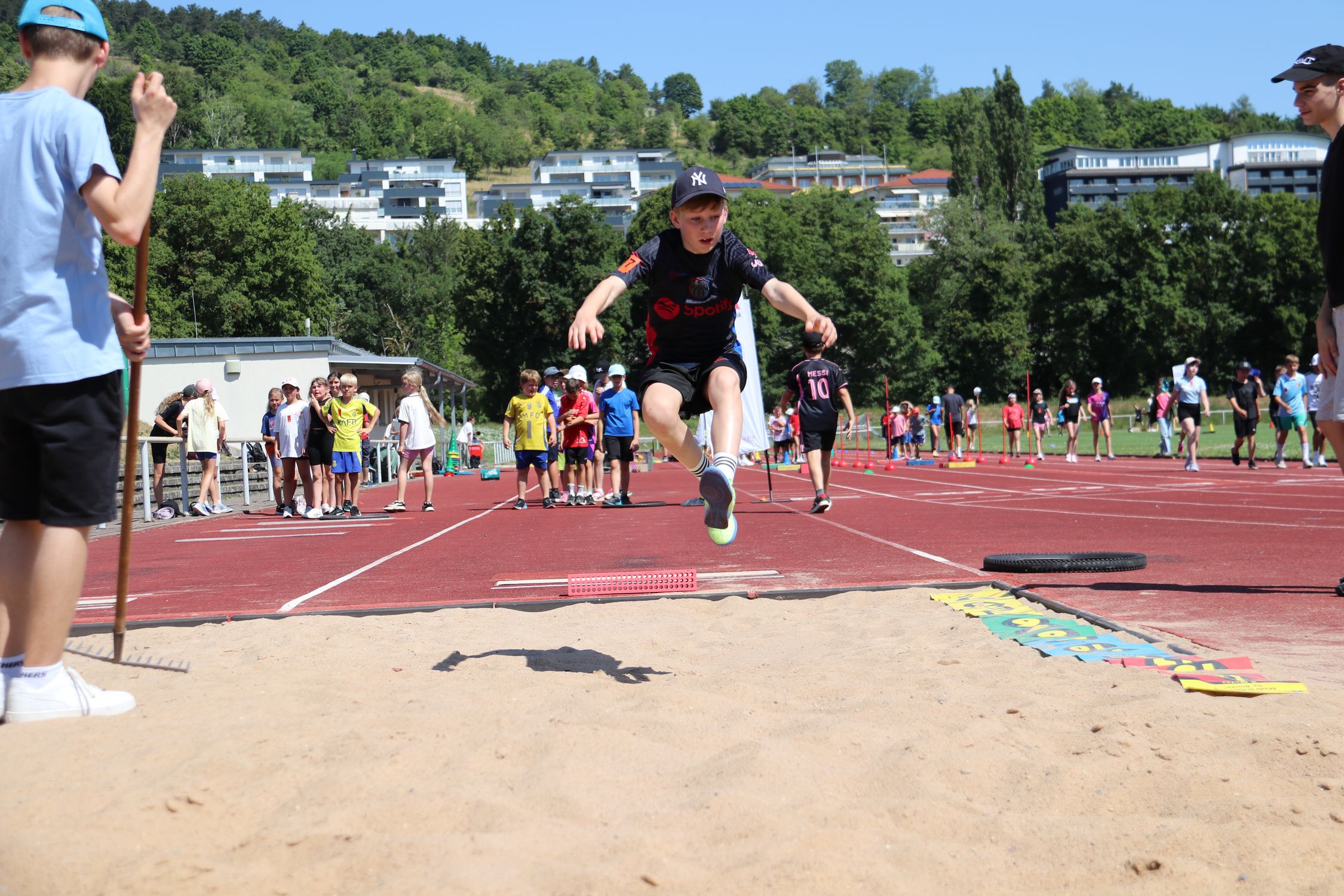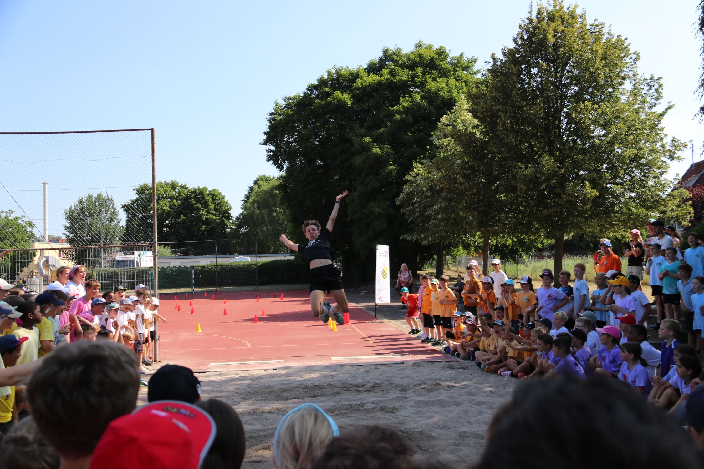 Noch in der gleichen Woche, am 04. Juli, wurde die Lichtenbergschule in Oberstenfeld besucht. Gemeinsam mit dem SC Ilsfeld war auch hier wieder der TGV Beilstein als kooperierender Verein mit dabei. Rund 320 Kinder tobten sich auch hier an allen Stationen aus und bewegten sich wie echte Weltmeister. Bei angenehm warmen Temperaturen schienen die Kinder nicht müde zu werden und gaben sowohl bei den Stationen der Bundesjugendspiele als auch bei den Spiel- und Spaßstationen Vollgas. Unterstützt wurden die Kinder von selbstgebastelten Plakaten, die stolz in die Höhe gestreckt wurden. Das Highlight der Veranstaltung war natürlich wieder die Top-Athleten-Präsentation. Der Athlet Oscar Hutzenlaub zeigte den Kindern, wie weit man springen kann. Die Kinder waren so beeindruckt, dass sich Oscar kaum vor Fans retten konnte. Noch nach der Veranstaltung war er damit beschäftigt, Unterschriften zu verteilen.