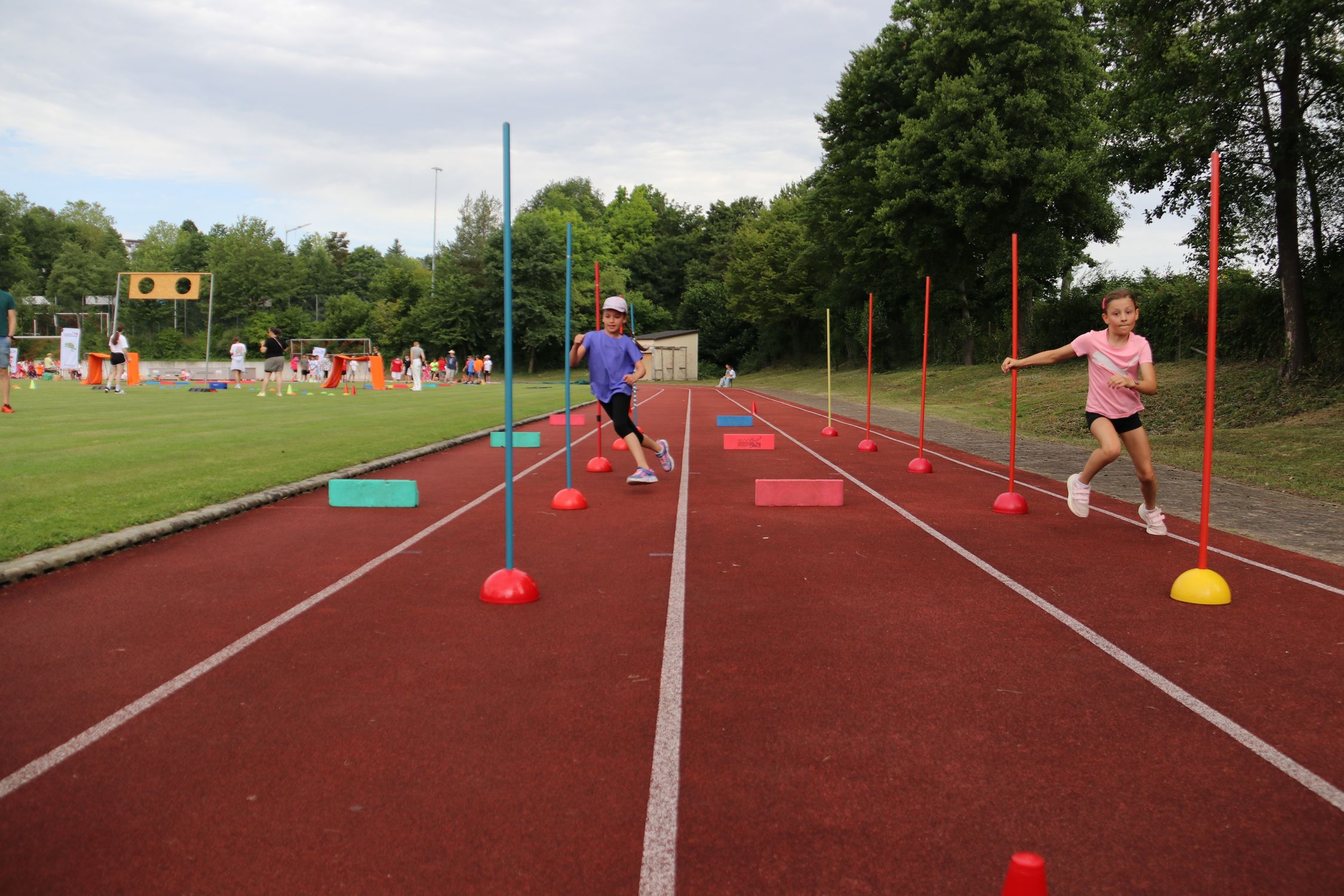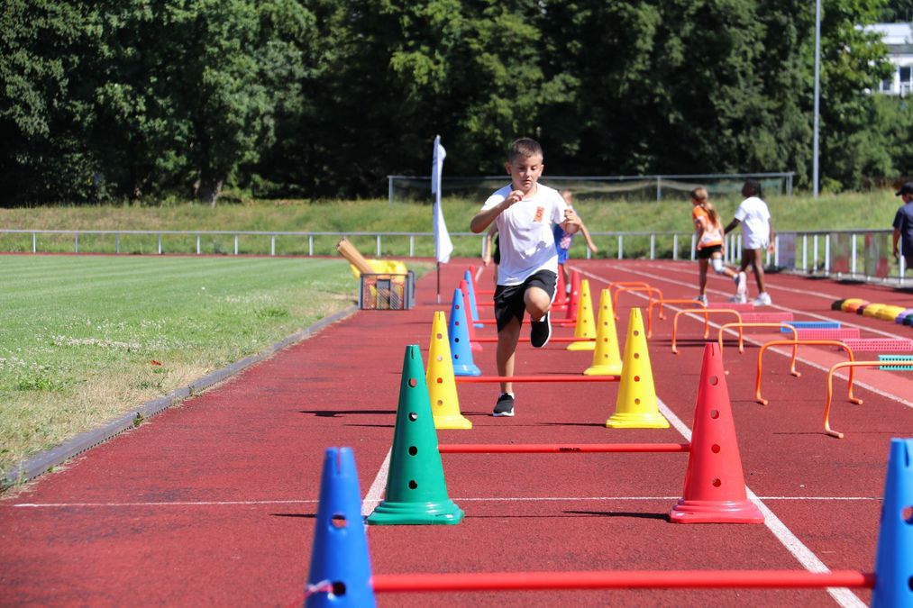 In Winnenden an der Kastenschule, am 07. Juli, musste die Veranstaltung aufgrund des schlechten Wetters anders als gewohnt stattfinden. Dank der Spontanität der Winnender Kastenschule konnte eine kleine, angrenzende Turnhalle als Ersatzort verwendet werden. Anstatt der gewöhnlichen acht Stationen wurden in der Schulturnhalle nur zwei Stationen aufgebaut. Hier mussten die rund 175 Kinder aus acht Klassen ihre Sprintstärke und Geschicklichkeit unter Beweis stellen. Um allen Kindern trotzdem ein spannendes Sporterlebnis zu ermöglichen, kamen die Klassenstufen 1 bis 4 nacheinander in die Halle. Jede Stufe hatte etwa 30 Minuten Zeit, in der ihre beiden Klassen abwechselnd die Stationen durchlaufen konnten. Danach wurde gewechselt, und die nächste Stufe war an der Reihe. Trotz der ungewöhnlichen Umstände ließen sich die Kinder den Spaß nicht nehmen. Die Stimmung war trotz des Regens bestens. Die Kinder konnten dennoch großartige Eindrücke gewinnen.